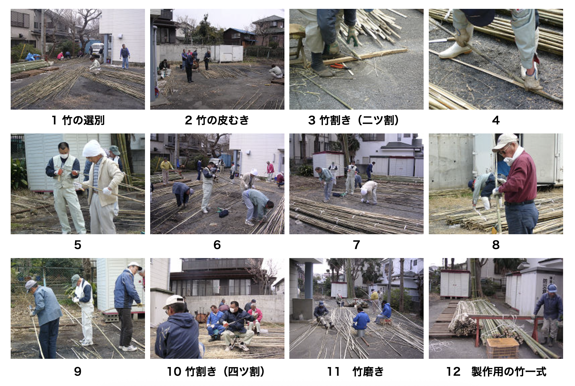 次に割かない「丸」、丸を竹鉈で半分に割いて「二ツ割」、